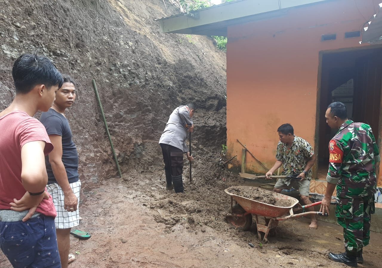 Membersihkan material bekas reruntuhan tanah longsoran yang menutupi halaman rumah warga terdampak bencana alam tanah longsor.